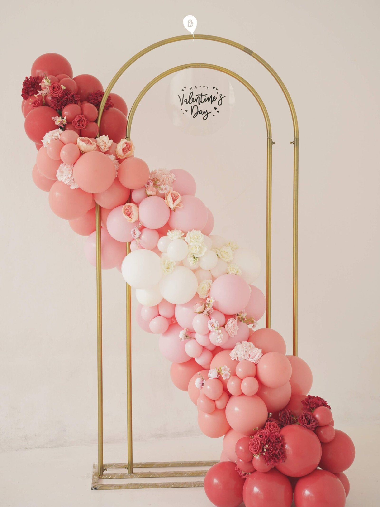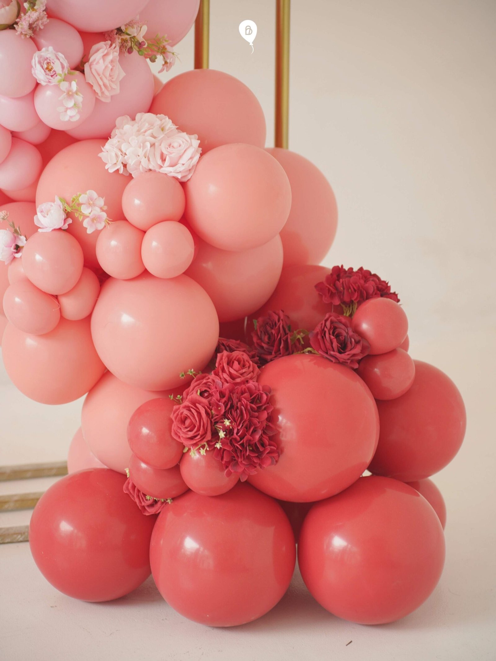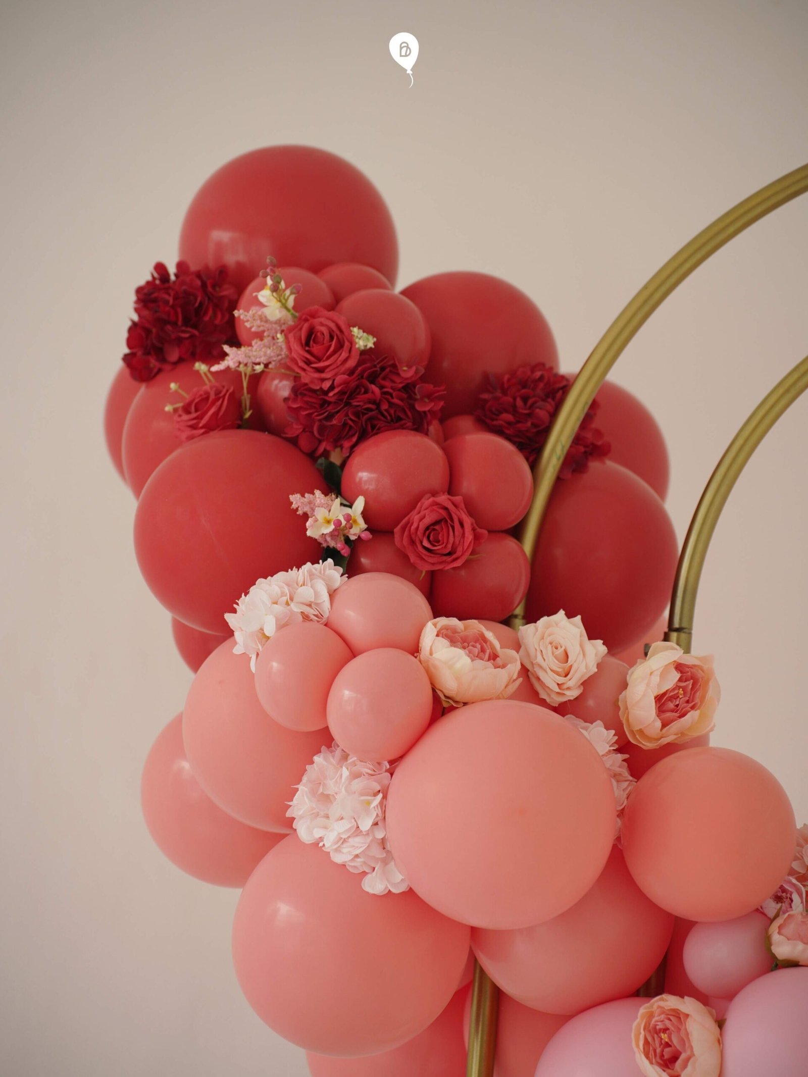 Red-to-pinkish balloon arch decoration